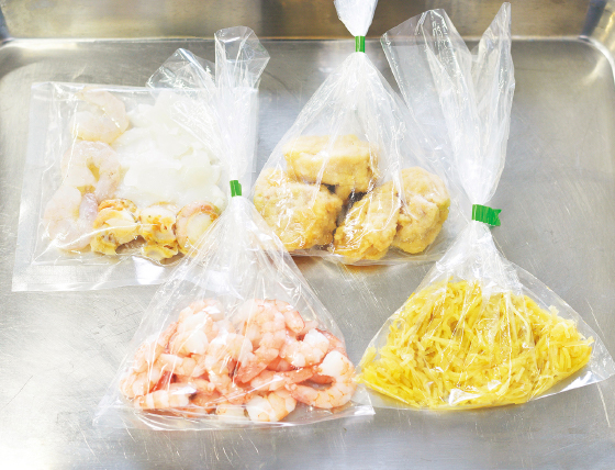 冷凍野菜、魚介類、畜肉類等を必要量に小分け。アレルゲンを除き、冷蔵品とのMIX包装にも対応。