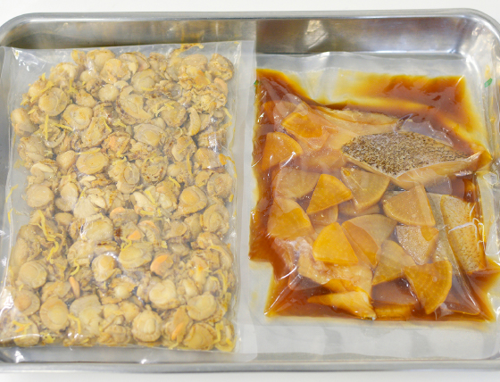 野菜、魚介類、畜肉類等をあらかじめ調味液へ充填することで、具材への味の浸透を向上させます。